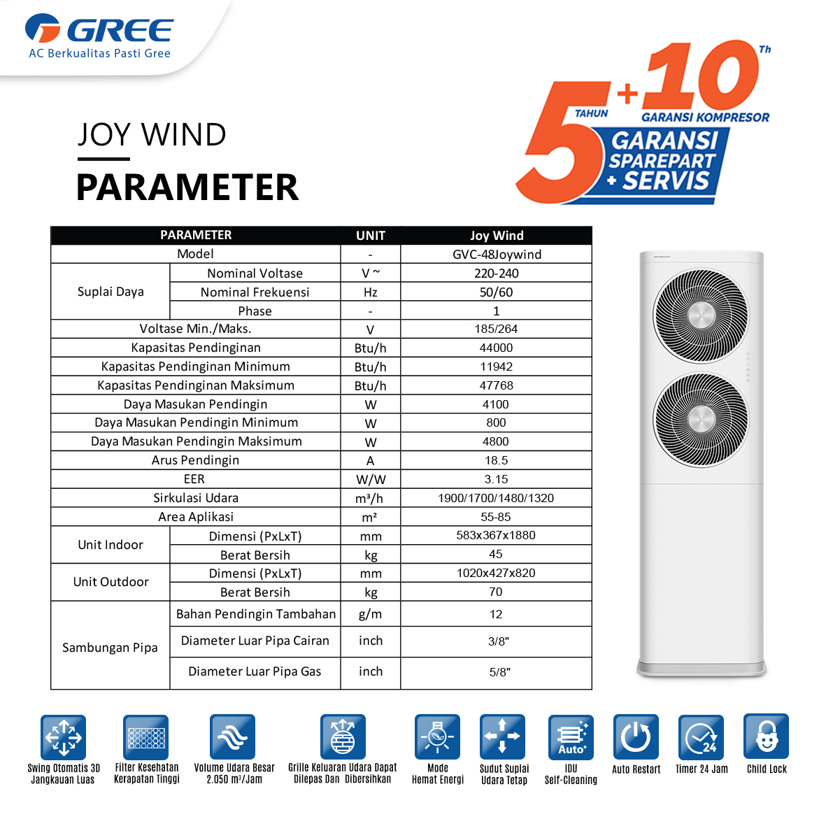 Dengan dua grille udara berukuran besar, unit ini mampu menghasilkan volume udara hingga 2050 m³/jam dengan hembusan yang kuat. Grille atas dirancang untuk mengarahkan aliran udara secara optimal, memberikan jangkauan hingga 9 meter sehingga kesejukan cepat menyebar ke seluruh ruangan. Sementara itu, grille bawah secara otomatis mendistribusikan udara ke area yang lebih luas untuk kenyamanan menyeluruh.