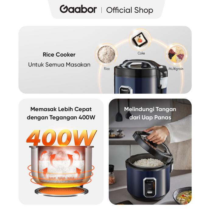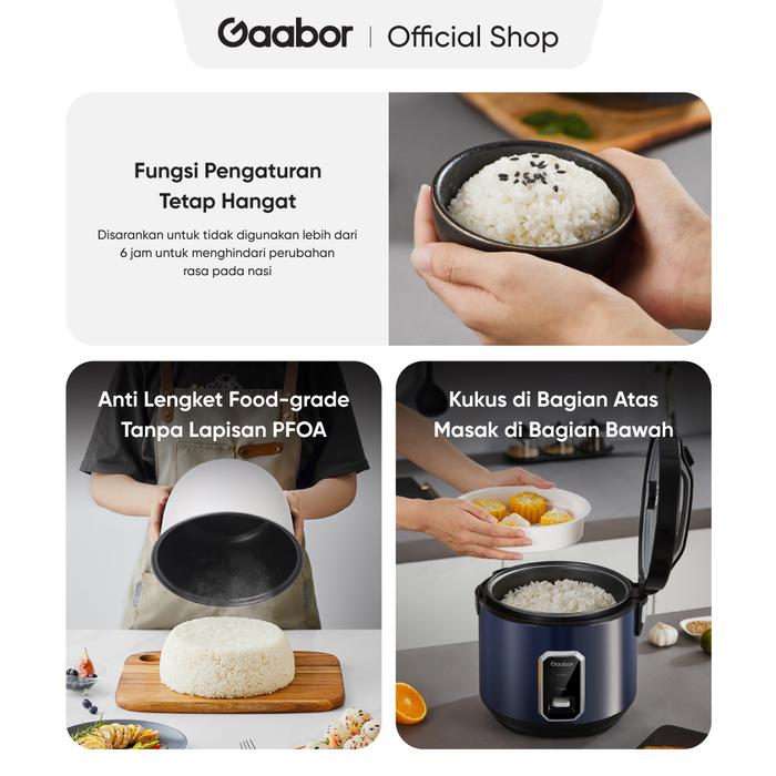 Gaabor Rice Cooker kapasitas 2.2L hadir sebagai solusi memasak praktis untuk keluarga Anda. Dengan teknologi pemanasan 360° dan fitur serbaguna, alat ini mampu menghasilkan nasi pulen, matang merata, dan tetap hangat sepanjang hari. Cocok untuk kebutuhan 4–6 orang.