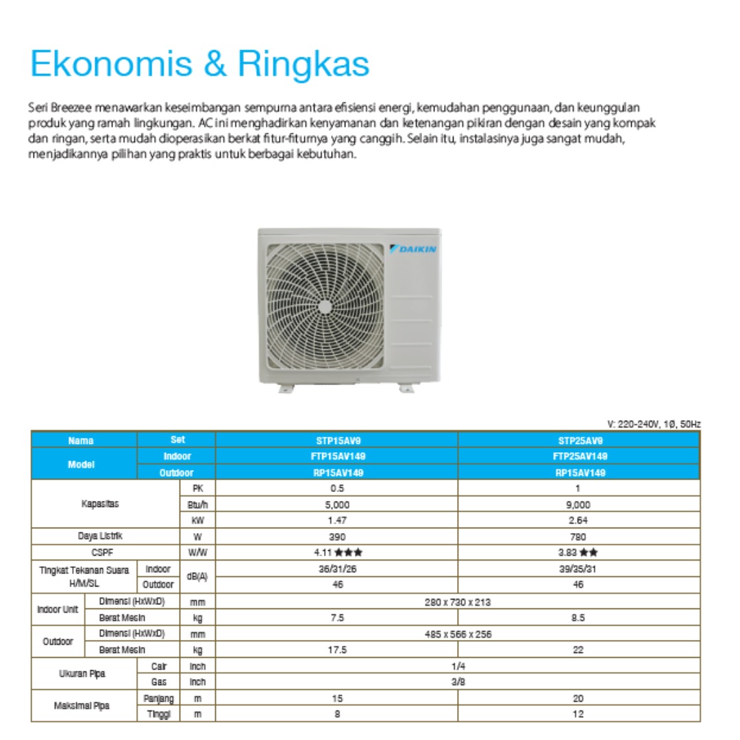 Dengan kualitas khas Daikin, AC FTP Series Breeze menawarkan daya tahan yang baik, suara operasional yang halus, serta perawatan yang mudah. Desainnya praktis menjadikan unit ini pilihan tepat bagi Anda yang membutuhkan AC non inverter yang andal untuk penggunaan sehari-hari.