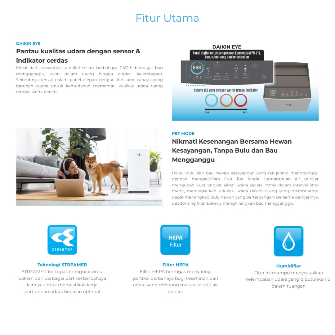 Daikin Air Purifier MCK70ZVM adalah pilihan tepat untuk menjaga kualitas udara tetap bersih dan nyaman, terutama bagi pemilik hewan kesayangan. Dilengkapi Pet Mode, unit ini bekerja secara unik dengan mengatur sirkulasi udara secara ritmik untuk menghisap bulu hewan yang beterbangan, sekaligus didukung deodorizing filter yang efektif menghilangkan bau mengganggu.