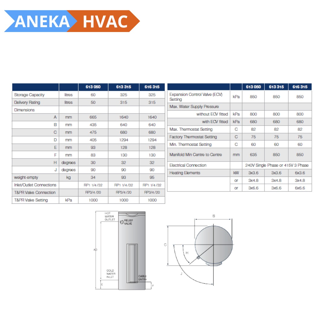 Rheem - Heavy Duty 613/616, water heater ini cocok untuk bisnis cafe, salon, restoran dan bisnis kecil lainnya. Terdapat 3 model elemen, anoda lebih besar, pemanasan dan recovery sangat cepat, dan 3-6 heating element