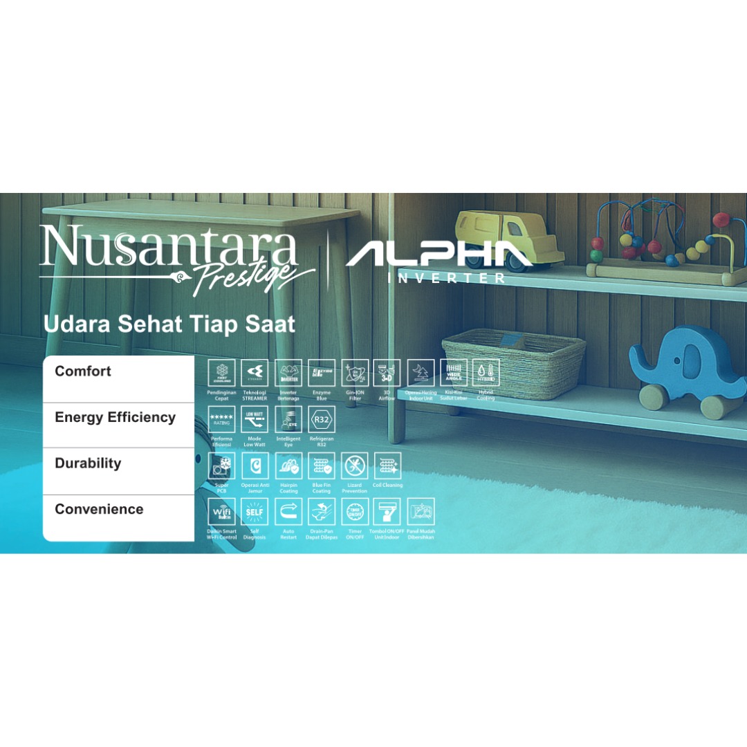 Cocok digunakan untuk hunian, kantor, maupun area usaha, AC Daikin Nusantara Alpha Inverter menawarkan pendinginan yang cepat, suara operasional yang halus, serta daya tahan tinggi khas Daikin. Desain yang modern dan perawatan yang mudah menjadikannya pilihan tepat untuk penggunaan jangka panjang.