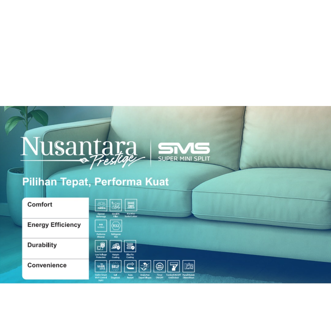 Beli AC Daikin Nusantara SMS Super Mini Slim di Aneka HVAC. Tersedia produk bergaransi resmi dan didukung layanan profesional untuk solusi pendingin ruangan yang terpercaya.