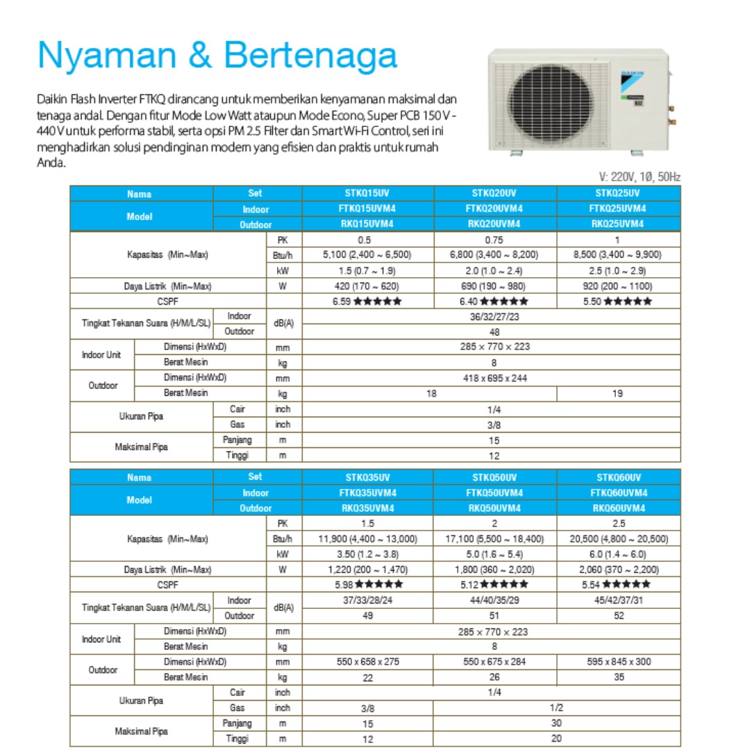 AC Daikin Inverter FTKQ Series dirancang untuk memberikan pendinginan yang efisien dengan performa yang stabil dan nyaman. Teknologi inverter memungkinkan AC bekerja lebih hemat listrik dengan penyesuaian daya sesuai kebutuhan, sehingga suhu ruangan tetap sejuk sepanjang hari.