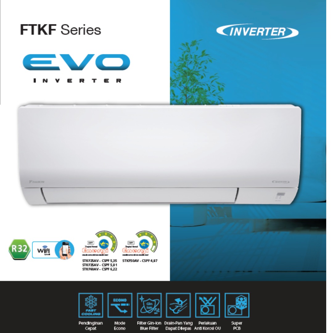AC Daikin Evo Inverter FTKF Series hadir sebagai solusi pendingin ruangan yang efisien dengan performa yang stabil dan nyaman. Menggunakan teknologi Evo Inverter, AC ini mampu mengoptimalkan konsumsi listrik tanpa mengurangi kemampuan pendinginan, sehingga ruangan tetap sejuk sepanjang hari.