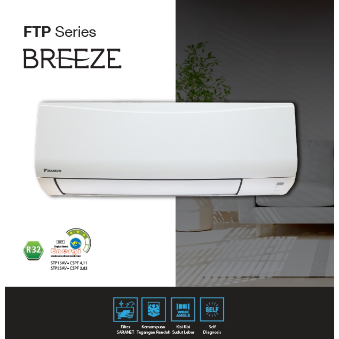 AC Daikin Non Inverter FTP Series Breeze dirancang untuk memberikan kesejukan yang stabil dan nyaman dengan pengoperasian yang sederhana. Pendinginan bekerja optimal untuk menjaga suhu ruangan tetap sejuk, sehingga cocok digunakan untuk hunian, kantor, maupun ruang usaha.