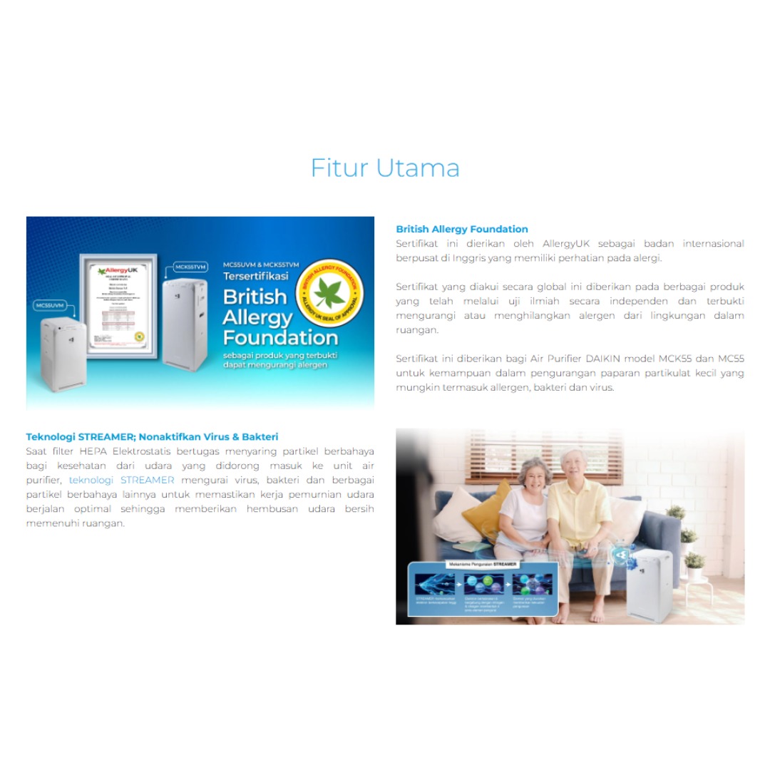 Produk ini telah memperoleh sertifikasi British Allergy Foundation (Allergy UK), pengakuan internasional yang diberikan kepada produk yang terbukti secara ilmiah mampu mengurangi atau menghilangkan alergen di dalam ruangan. Sertifikasi ini juga berlaku untuk Air Purifier Daikin model MC55 dan MCK55, dengan kemampuan mengurangi paparan partikulat kecil yang dapat mengandung alergen, bakteri, dan virus.