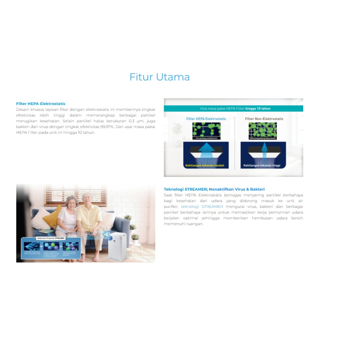 Saat HEPA filter menyaring partikel berbahaya dari udara, teknologi STREAMER bekerja mengurai virus, bakteri, dan partikel berbahaya lainnya. Kolaborasi ini memastikan proses pemurnian udara berjalan optimal dan menghasilkan hembusan udara yang lebih bersih dan sehat ke seluruh ruangan.