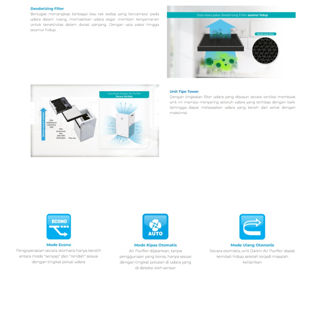 Daikin MC30YVM7 dirancang untuk memenuhi kebutuhan udara bersih dan sehat di dalam ruangan secara optimal. Susunan filter udara secara vertikal memungkinkan unit ini menghisap dan menyaring udara dengan lebih efisien. Dilengkapi teknologi STREAMER serta HEPA filter elektrostatis dengan usia pakai hingga 10 tahun, Daikin MC30YVM7 menjadi solusi praktis untuk menjaga kualitas udara tetap bersih, aman, dan nyaman setiap hari.