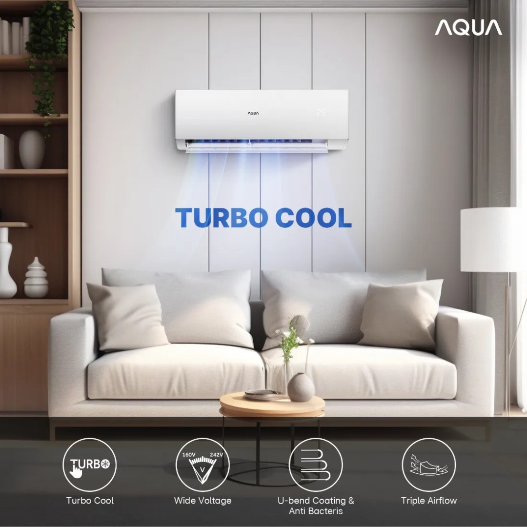 AQUA Turbo Cool Air Conditioner AQA-KCRFQAL hadir untuk Anda yang membutuhkan pendinginan cepat dan maksimal. Dilengkapi dengan teknologi Turbo Cool, AC ini mampu menurunkan suhu ruangan lebih cepat sehingga kenyamanan dapat langsung dirasakan, bahkan saat cuaca sangat panas.